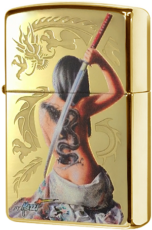 Для украшения лицевой поверхности этой зажигалки High Polish Brass использовались сразу две технологии. С помощью глянцевого травления в сочетании с цветным изображением вышел затейливый дракон и изящная дама с катаной. В комплект входит подарочная коробка. Для оптимальной работы рекомендуется заправлять оригинальным топливом Zippo.